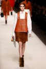 This collection was a fusion of faux-utilitarian pragmatism and flamboyance. There was a bit of the Alpine worker to the pinafores and chaps-like leather additions attached at the hips to skirts. Bibs and aprons in paneled constructions were fastened by giant buttons. Continuing with the add-a-flower motif started two seasons back with orchid corsages, here, birds of paradise popped out of color-blocked fur and shearling bags.