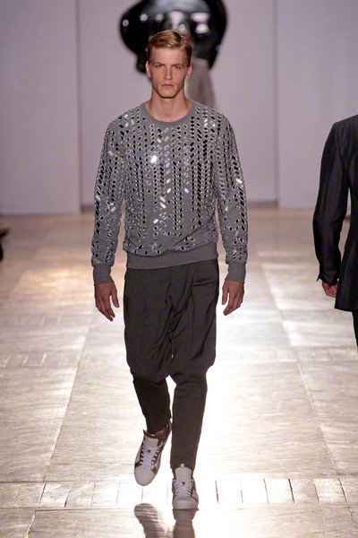 The Monsieur-collection lies close to what the designers like themselves, a mix of streetwear and tailored suits with a touch of the unexpected. For next fall Viktor & Rolf unveiled a refined collection in a dark (mostly black) color palette mixing formal and casual, ranging from quilting and trousers with elasticated cuffs and a focus at the dinner jacket. Splashes of black paint were on the floor but also at trousers, a models’ face and in silver on a T-shirt.The unexpected lies in the layering and mix of different textures and fabrics. Of course the collection has all the ingredients of next fall: the large, comfy cardigan, the suit, the knits, the boots, the grays and the blacks.
