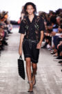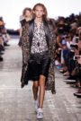 The weightiness of the outerwear found counterpoint in a new take on the bandage dress, wrapped and slashed to reveal skin and attitude. Another dress, a white sheath, got tufts of au sauvage fur at the waist and shoulders. Eventually these ideas mingled, becoming increasingly decorative for the finale of triballike motifs rendered in slashes, eyelets, grommets and intense embroideries, worn by a procession of glamorous she-warriors. Power dressing of a different sort.