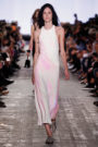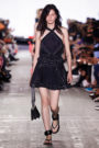 The spring 2017 collection of Alexander Wang was delightful and young and was lightly inspired by the surfculture. Youth culture and irreverence are key tenets of his brand and this time he choose fresh material and handled it with the balance of irony, relevance and good design. t Rash guards were interpreted into slinky dresses with neon seams. A black bikini top laced around the torso was worn over a sequin skirt that wrapped like a beach towel. A cropped fluorescent-pink sweatshirt with a palm tree print bore the phrase “mind detergent.” Wang also used a cliché Eighties-Nineties thorny tattoo into a print, and gave the ultimate symbol of slacker culture — the bathrobe — a witty upscale treatment in shaved mink. Flat sandals had straps that looked like surfboard ankle leashes and necklaces looked like lifeguard whistles.