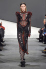 The weightiness of the outerwear found counterpoint in a new take on the bandage dress, wrapped and slashed to reveal skin and attitude. Another dress, a white sheath, got tufts of au sauvage fur at the waist and shoulders. Eventually these ideas mingled, becoming increasingly decorative for the finale of triballike motifs rendered in slashes, eyelets, grommets and intense embroideries, worn by a procession of glamorous she-warriors. Power dressing of a different sort.