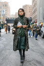Alexander Wang shows cutting-edge technical finishings in yellow-splashed sweaters with crinkled surfaces that change colors through the models’ body heat. 3.1 Phillip Lim presents pretty collage prints in peppy cold-weather pastels on bombers as well as dresses. Thakoon goes cocooning with turtleneck shoulder fitted cape-lets, funnel-neck scarfs and soft shearling jackets. Alexander Wang stages bold and brutal boots matched with smart tailoring – lofty balloon silhouettes in featherweight parachute silks and satins.