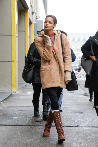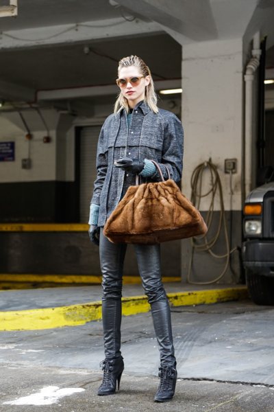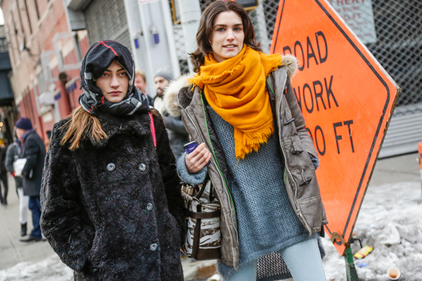 Alexander Wang shows cutting-edge technical finishings in yellow-splashed sweaters with crinkled surfaces that change colors through the models’ body heat. 3.1 Phillip Lim presents pretty collage prints in peppy cold-weather pastels on bombers as well as dresses. Thakoon goes cocooning with turtleneck shoulder fitted cape-lets, funnel-neck scarfs and soft shearling jackets. Alexander Wang stages bold and brutal boots matched with smart tailoring – lofty balloon silhouettes in featherweight parachute silks and satins.