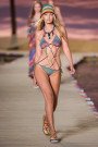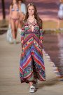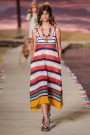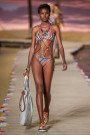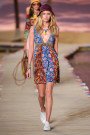 At Tommy Hilfiger we sat back and relaxed while the designer took us on a trip to the Carribean. He recreated the turquoise waters of Jamaica and the sand beaches of Mustique as the backdrop of his catwalk. So his tropically, hippy-ish dressed models walked along the beach. Hilfiger’s signature American sportswear perfectly worked together with the island life dress code. Billowing dresses sport lush flora and fauna patterns, while tropical hued patchwork and vibrant stripes energize sundresses and separates. Denim jackets and chinos are faded for a loved effect and accented with beaded tapes and whip stitched borders. The traditional cricket sweater reinvented in homespun crochet, polos done in netted mesh, and oxford shirts personalized with embroidered eyelet. Roomy beach totes and layered espadrilles, colorful jewelry to top it all off. The holiday theme might have been a bit overdone every now and then and we’re not sure if those knitted bikini’s will take off, but the designer’s aim to reach out to a new generation of globetrotters might just work out. Island hopping ended with a splash as all models paraded through the water for the show’s finale.