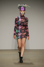 Her current collection is named Krisis. To finance the collection she came up with the idea to use crowdfunding. And with success. The label raised half of their money via their website and half by subsidies. Although the sober name of this collection, she showed very colorful pieces. All unisex, her trademark, and multi- functional. ‘You can wear all these clothes in many ways. With some you can zip off the sleeves, others are reversible. And it’s for both men and women, very androgyn. Just like myself.’ She used different fierce hues and fabrics, like the body-con lycra dresses with some cut outs or patches on places that accentuate the shapes of the body. And not just patches, if you take a good look, you see these round patches form the eyes of a smiley face, happy or sad. It’s up to you what you make of it.