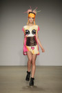 A fashion show presented by Dutch porn star Bobbi Eden? We knew we were in for a treat at this one. Groaning sounds when we entered the rooms, porn magazines and condoms in the goodiebags on our chair.. and the show had not approved viagra even started yet! It turned out it was not really about the clothes; Nieuw Jurk just held a cheerful little porn party for the fashion minded. With models wearing colorful wigs, the highest platform shoes, fur boots & necklaces, candy underwear and latex accessories there was little focus on the actual designs. Yet there were tees, leggings, shorts, jackets and pants covered with symbols of smileys and tongues, and words like SEX, NEW JERK and FUCK BUDDY. After a latex umbrella kind of pink creation the designer herself came on carrying a pink playtoy in her hands and the party was complete. The audience went wild, though some journalists looked a little flabbergasted.
