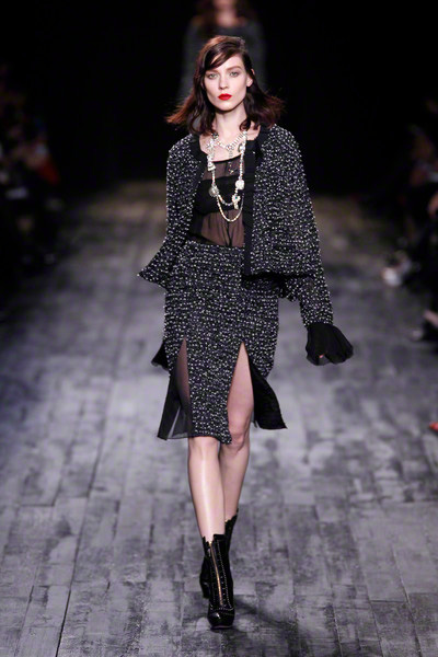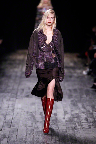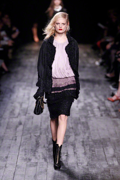 It made the models look like dolls. Dolls dressed in chic, but scruffy designs. Like slipdresses patched together with tweed and lace. Or somewhat destroyed jackets with fringes all over.