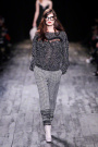 Sweet skirt suits and polka dot dresses in shiny gray and nude were funked up by multiple chunky chain necklaces. A sheer polka dot top worn with a playful hairy skirt looked daring.