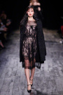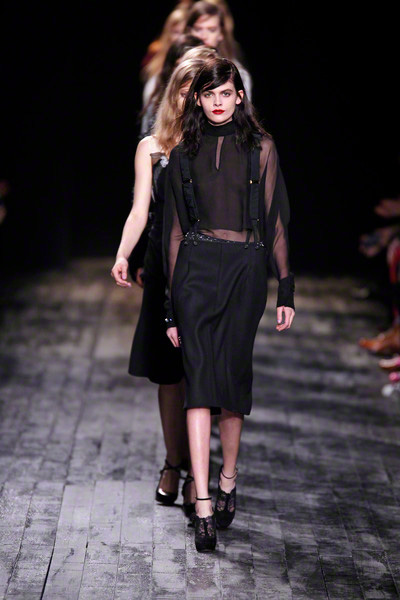 The fall collection, inspired by the Belle Epoque/Bausch had the same romantic feeling as the Ricci spring collection, though there was more contrast visible this time. Woollen coats were combined with airy transparent tops. Tulle and leather were mixed in several looks as well.