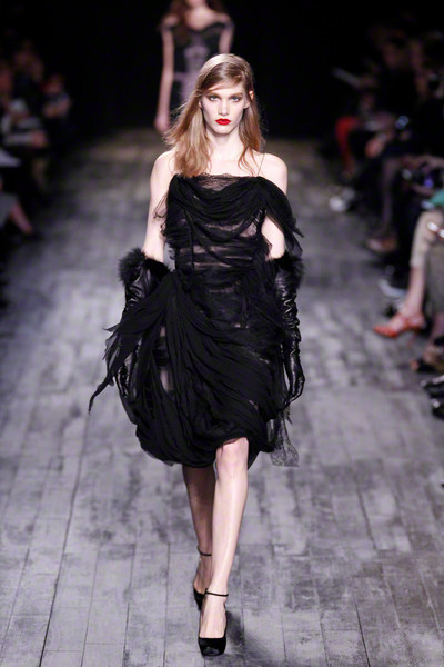 For his fall collection Peter Copping felt inspired by a seventies Nina Ricci ballet ad. He used the soft side of the world of ballet to create his contemporary yet classic looks. As the first models appeared on the red runway, lit by red lights, walking to the sound of a live piano (by Katia and Marielle Labèque) the right mood was set. Copping’s Parisian chic models looked flawless portraying some of his ultra-feminine silhouettes. They wore pencil skirts and cigarette pants, A line coats and strapless evening gowns in simple (yet perfect) shades of ivory, nude, red and black. Accentuated waists, bustiers, long gloves, perfect red lips and cute headbands brought an extra dose of romance to their appearances. Copping added modern touches in the form of unfinished dress details, visible bra straps a fur lined parka and a few bare bellies on sight. Just to provide the collection from becoming a full on back to the seventies ad time travel.