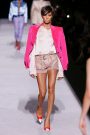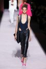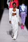 The spring summer collection Tom Ford presented was a classic one: the calculated decadence we know so well from Ford, rendered in a split between athletic-derived sportswear and power-woman goddess gowns. Crossover of athletica into the primary daywear vernacular aside, Ford loves tailored polish. He opened with a bold-shouldered pale pink satin tuxedo jacket over a liquid metallic top and short-shorts, rolled at the hem. Unlike the old Gucci days when he worked the daylights out of a single look, here he offered options, some approachably chic, others challenging to all but the most secure of attitude and body image: classic pantsuits, dressed-up dark denim, short leather trenches and racy jumpsuits. One, a long, backless drink of water in white crepe, rang the bell of a long-ago Gucci dress with a cutout abdomen. An infusion of wit came in an only Tom take on the twinset: slouchy chain mail shoulder bag and matching briefs worn with a louche pale pink top. As for the eveningwear, strong shoulders and sequined sleeves transported classic draping from ethereal to aggressive, as glam as it gets.