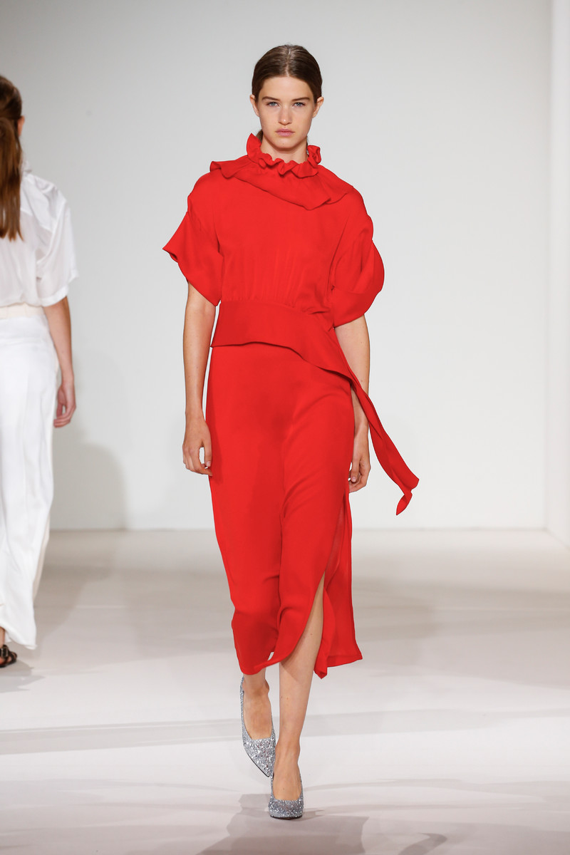 Her spring collection was flush with great color — soft, mineral blue, pink and lavender as well as vivid red — worked on silhouettes that exuded gentle power. Pertly tailored takes on utility shirts, some done in men’s checks, were paired with light pencil skirts. Fluid oversized shirts were layered over easy, wide-legged pants, and new suits came with boxy blazers and slim pants. A red dress with a high, gracefully ruffled neckline and cutaway panel at the waist was cut in a relaxed but seductive line. Many silhouettes were covered up, but not without allure or playfulness. Candy-colored glitter pumps and the occasional jeweled anklet offset the collection’s womanly sophistication with the perfect boost of girlish whimsy.