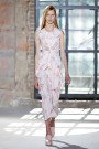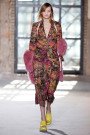 Lak sent out a beautiful wispy silk floral mid-length dress with a twisted cutout detail at the bodice, followed by a cargo pant and tunic version. But it was the Impressionist-printed jacket and matching wrap skirt, adorned by a fur stole worn like a slouchy backpack, that set the tone.