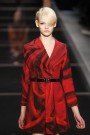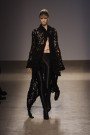 Gareth Pugh may have used a softer approach for his fall/winter collection, his models – with black sprayed foreheads – looked as Gothic as they ever did. They wore heavy, stiff, leather designs and some transparent pieces. Many clothes were pointy to the sides and a lot of the fabrics had frayed ends.