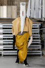 Junya Watanabe likes the ounk-era and this time het drew inspiration from the source: London. His punks were dressed in electric yellow and red plaids that were patchworked with black leather, sequins, traditional tailoring fabrics, a host of floral and jacquard upholstery plus leopard prints done the classic way. Everything was collaged: amorphorous capes and dresses crafted from circles and pointy triangles, some fused with motor jackets, many worn over pleated kilts and layered with fishnet sleeves and tights.