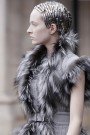 The Alexander McQueen-collection was an ode to The Ice Queen and her Court. Sarah Burton – who’s talent and character keeps the McQueen-house alive and kicking – gave her heroines a colorless faces and small, metal-covered heads. She build the collection slowly, using white, black and lilac and a very McQueen silhouette. It was molded, strong, and sometimes fitted like a harness. To avoid a too tough and edgy impression Burton tempered it wit hand-made silk and wool tweeds with litlle pieces of mink and fox.