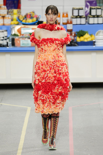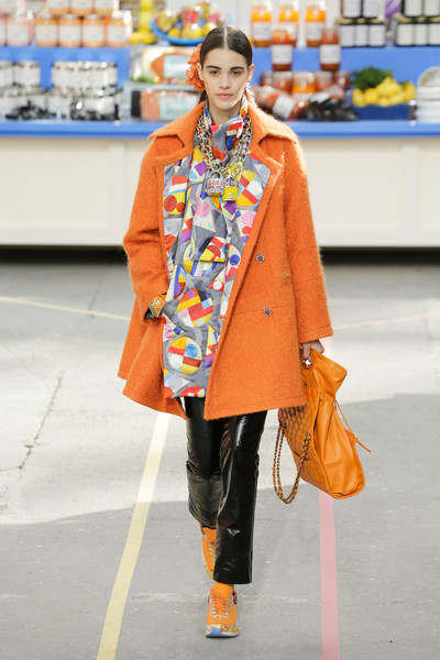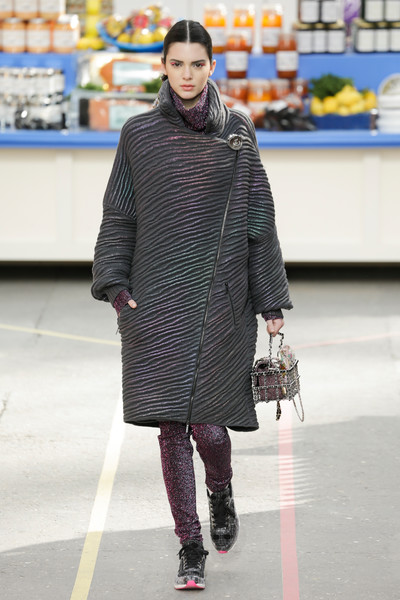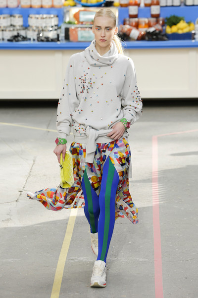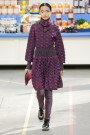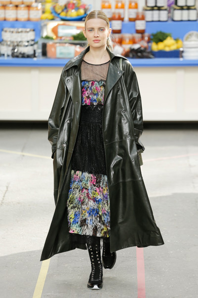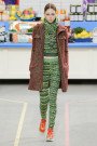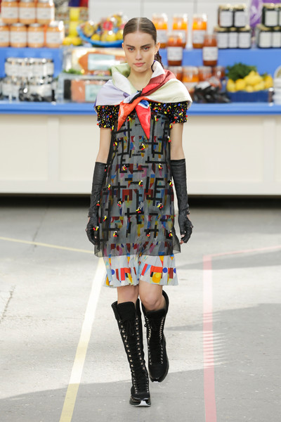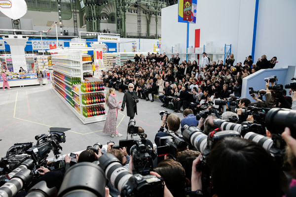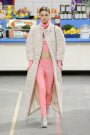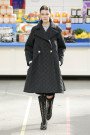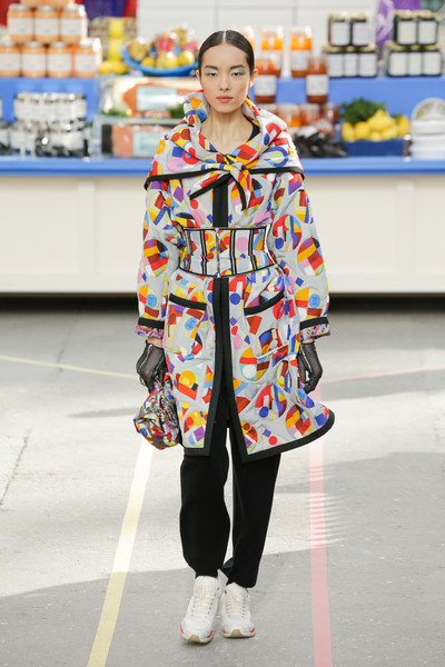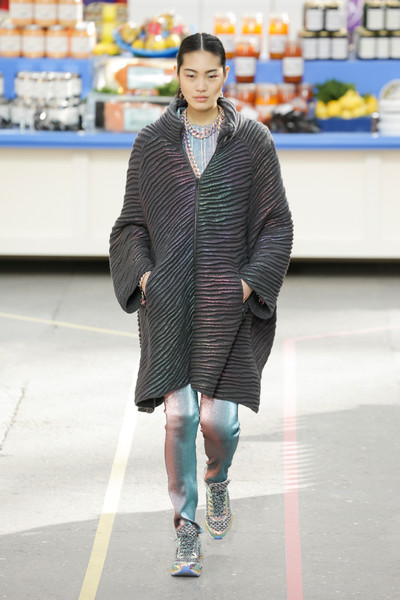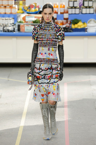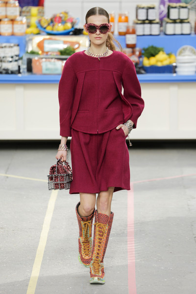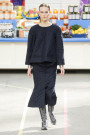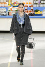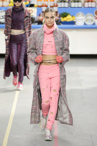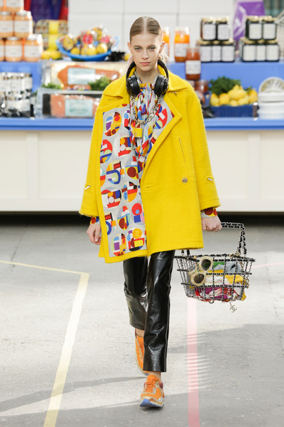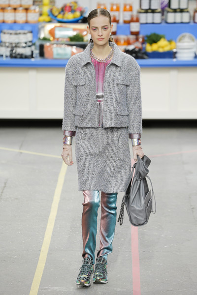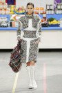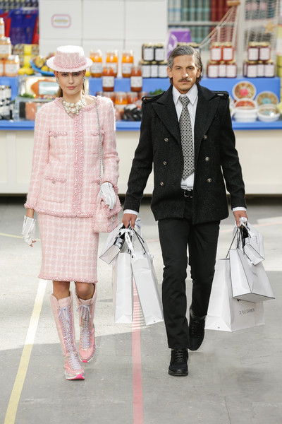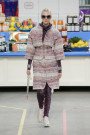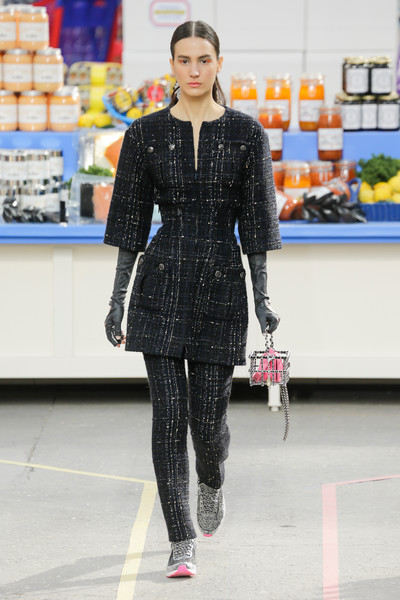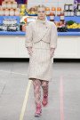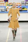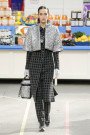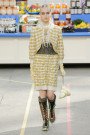 This morning Karl Lagerfeld turned his show venue into a large Chanel supermarket where models, dressed in the latest creations of the French fashion house, did their weekly shopping. And of course it wasn’t just any supermarket. Karl made sure everything was customized CC, from the Coco flakes, the Tagliatelle mademoiselle and the Eau de Chanel to the shopping carts. Grocerie shopping never was this chic. And though all we wanted was to get our hands on those designer groceries (after the show the venue was completely plundered until all shelves were empty) we had to try and focus on the clothes. Leggings and crop tops with turtle necks, worn with metallic sneakers and oversize tweed coats at first. Tweed ensembles and checked skirt suits with sporty sneaker boots later on. Followed by monochrome all leather looks, by metallic creations, rainbow bright prints and girly pink designs. All decorated by large chain accessories, fur details, sunglasses, pearls and grocery baskets as the new it-bags for 2014. Shapes were long and lean as well as cartoon shaped. It was a little bit of everything for everyone really, yet what the designs had in common was their wearability. Nothing too tight, too crispy clean or too over thought. Just a selection of casual clothing anyone would wear on a trip to the supermarket.. Almost…