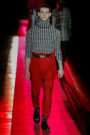 “I’m always attracted to the elegant man, but I’m always kind of a mess,” said Haider Ackermann backstage ato WWD after his his wild patchwork of a show. The collection had a punk feel, with magnified houndstooth fabrics patchworked with black leather for vests and jackets; a long, dark red military style coat, and plaid, checked or striped trousers, some with tartan tops knotted around the waist. Velvet played a starring role, patched together with leather or wool for a jacket or adorned with devoré fabric with ragged edges or more houndstooth checks.