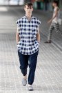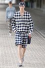 Louis Vuittons menswear-designer Kim Jones dedicated his collection to America, it’s hippies and nerds, its forest rangers and movie-stars. So the clothes moved from preppy blazers in exploded checks tot bush jackets with tie-dye effect an slick evening-wear. There were varsity-jackets, raincoats, surfshorts, blousons and of course black dinner jackets. Blue, brown, mustard and gray were the main colors.