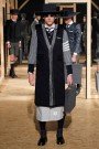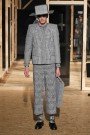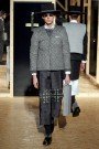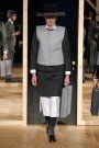 While blindfolded models hammering on a wooden construction formed the backdrop of Thom Browne’s fashion show, his walking models appeared from behind. The fact that they wore checked skirts and dress like designs could have been enough to keep us press interested. Yet Browne added an extra dimension to his looks, making them unique yet unwearable. His grey flannel suits, his cross printed vest, his checked pants and illusionist coat; they were all done in a boxy style. The effect of the square fits and the super stiff shoulders was even amplified by his square hats, rectangular sunglasses and geometric suitcases. Let’s hope Browne hat some real boxes hidden underneath his designs, so that when he removes those, he can actually sell some of these fall/winter creations.