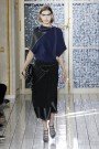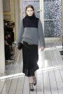 The punk spirit of last season seems gone but is replaced by a softer, more feminine theme. Soft, draped longer length skirts, knitted leather, tunics worn over pants, skinny pants with zippers at the back of the legs, soft oversized coats and comfy sweaters made a gentle look. Of course there we graphic colorblocking elements in the collection, andbesides black, white and gray Ghesquiere used orange, blue, brown and green.