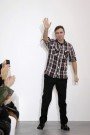 He showed many different versions of a wide short, worn with laced boots, which we doubt many men will want to wear. Rottweiler printed sweaters were combined with checked blouses and many of the jackets had black leather part.
