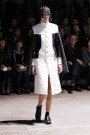 Jackets and coats in black, grey and white were the key items of the show. Kawakubo used lots of black leather and added corset-details, hair nets and multiple belts to her looks.
