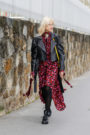 Rousteing diluted the impact of some dresses by adding panels depicting wolves, the wolf designsalso returned on T-shirts that anchored a boho rock star wardrobe of maxi cardigans, eyelet-studded leather and thigh-high boots.
