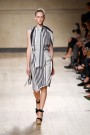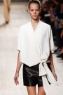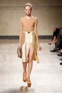 After four years of silence Phoebe Philo (who formerly worked for Chloé) showed a new collection during her runway debut for Celine. By deciding a new iconic look she went back to basic. The clothes looked sober in shades of beige, white and camel. There were hardly any accessories and Philo only used one or two pieces of clothing per outfit. No fuss but clear, tight and wearable shapes and fits. ‘A kind of contemporary minimalism’, as she called it herself. Philo designed many leather pieces, almost all without visible seams, pockets, zippers or buttons. There were some cross-laced items, a few wide sleeves and several epaulettes. A leather coat with a rounded standing collar was the most striking piece of the collection. Philo’s Chloé-touch was visible in wide pants and wedge sandals. Of course the big question is: will Philo be able to bring back Celine’s success? Judging from the enthusiastic reactions of the audience, she will. (Tess van Daelen)