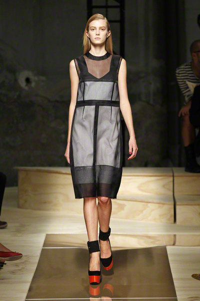 So expectations were high for her second collection. But as Philo said in her interview with T-magazine, she continued her work with great investment pieces in the best fabrics and in her signature clean, sophisticated cut. No frills, but deep blue coats instead, tailoring, short jackets, skinny pants, white (lace) shirts and leather pockets as a contrasting detail at A-line skirts. Ultra-chique and a winner were the white lammy capes. Simple, but feminine.