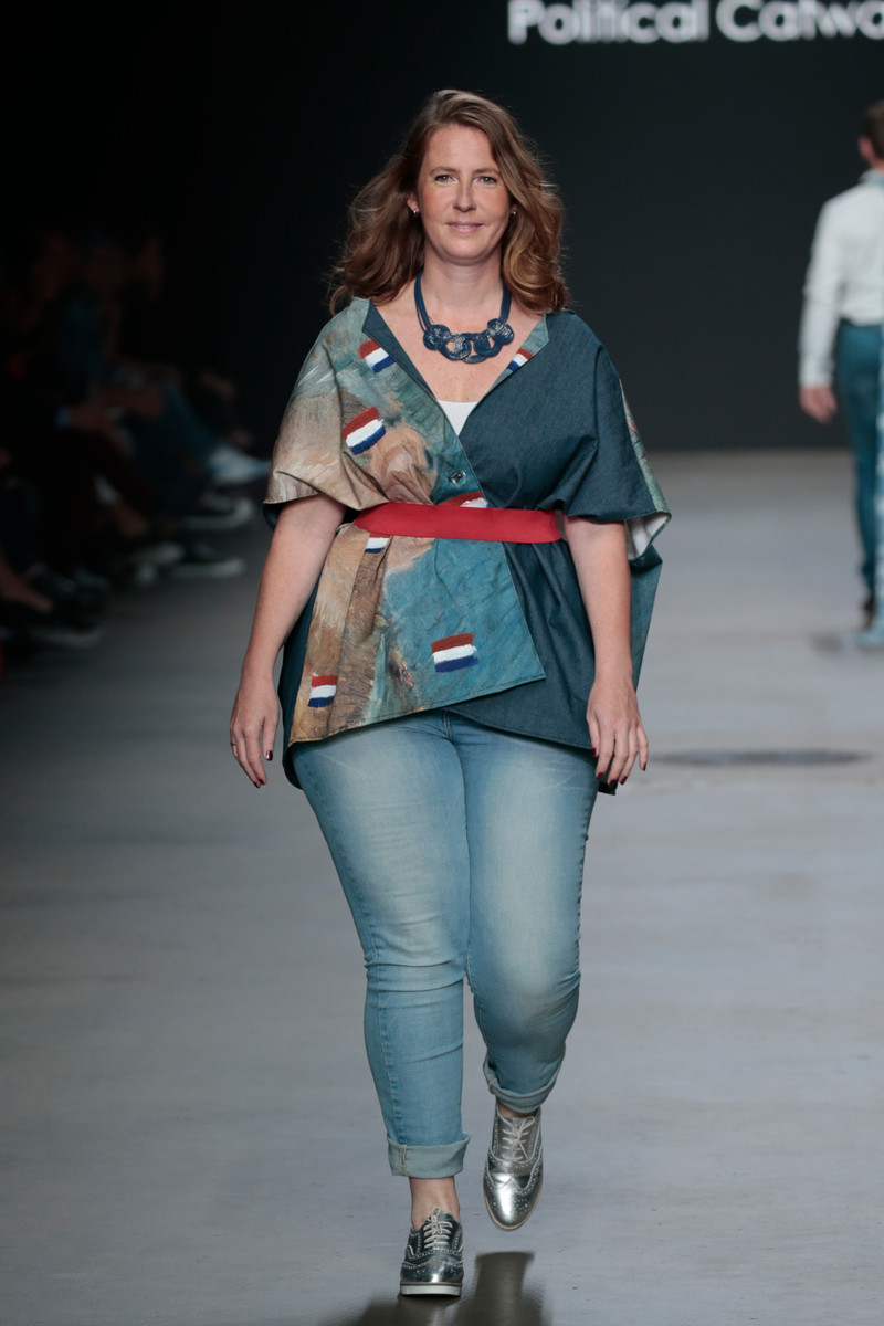 It’s definitely not a first that fashion shows have been linked to political engagement. But it’s definitely a first for these pupils, who used fashion as a tool to air out their thoughts on politics and democracy. While the musical background was filled with sound clips from Dutch political debates, the politicians slash models came walking down the runway in designs such as a jumpsuit covered with Twitterbirds, a skirt made out of newspapers, a dress with vote pencil fringes, a Dutch flag kaftan or a Van Gogh printed shirt.