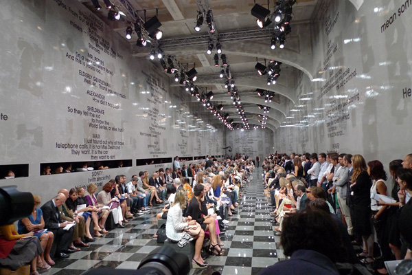 An impression of the stage at Prada, a labyrinth of information, facts & figures and choices regarding (virtual) daily life. The world of Prada, as the designer said. The audience was seated in colored blocks or at a high tribune.