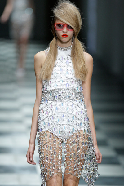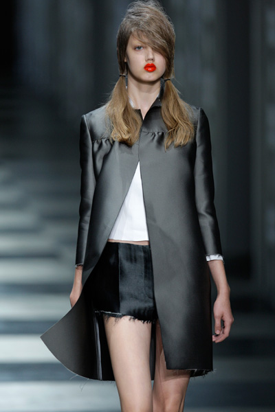 This was yet another Prada-collection which leaves you distressed and thinking about what was going on. Someone called it retro-future, severe chic or restraint meets assertiveness, I would call it women breaking free. Disturbing jazz filled the room and the models were walking down the runway with beehive-hair, bare faces and in prim dresses with high pointed shoes.