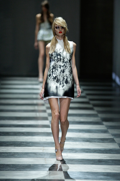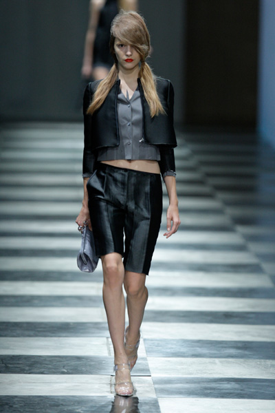 The Prada ss2010 collection was one of those collections with a deeper message, but I could not figure it out immediately. Something old, something new, a bit of vintage fifties Miami and clean, modern shapes, artificial meets today’s reality. There was a hint of sportswear with the bikershorts, wide (halter) tops and transparant bags and shoes. Prints were stunning: projections of beachlife, chandeliers and flowerprints in black and white, greytones and pastels. It was more about the message and concept, than wearability.