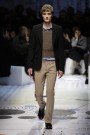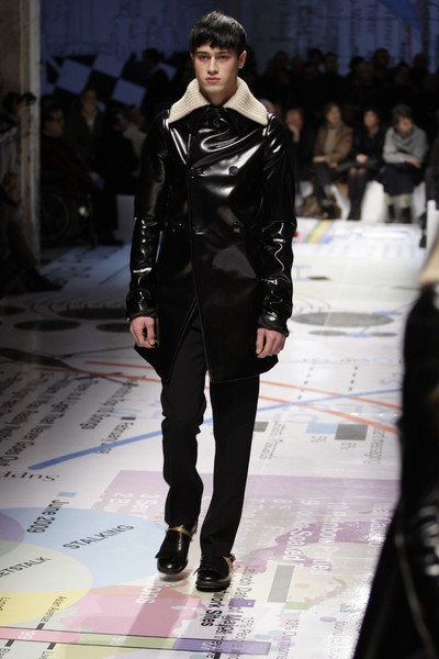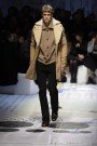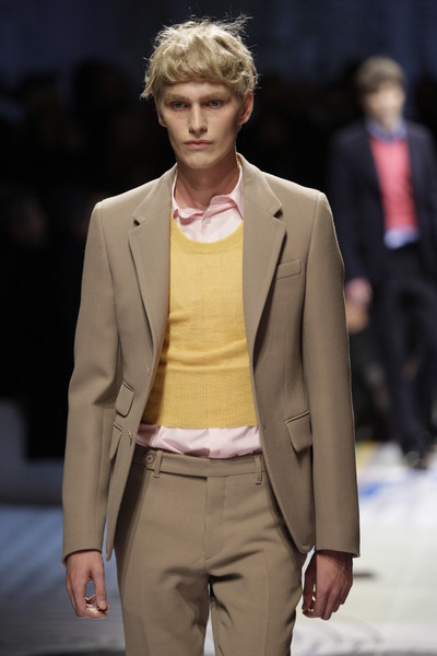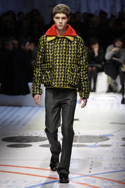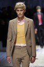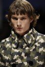 The Prada-show was held in the designers ideal – virtual- world full of facts & figures, info-graphics and spaces. A world that seems more appealing to young people who easily absorb all that information. It was the young Miucca was aiming to. The models strolled through the labyrinth of info in their sometimes childlike, polished clothes in bright camouflage-prints or bleached colors, beige and black. The collection had that typical vintage Prada touch – like an old seventies Vogue Homme – without being too dorky. The look was polished, almost synthetic, but the colors (yellow, rose, blue, beige and black) and fractal-camouflage added the right dose of reality and warmth.