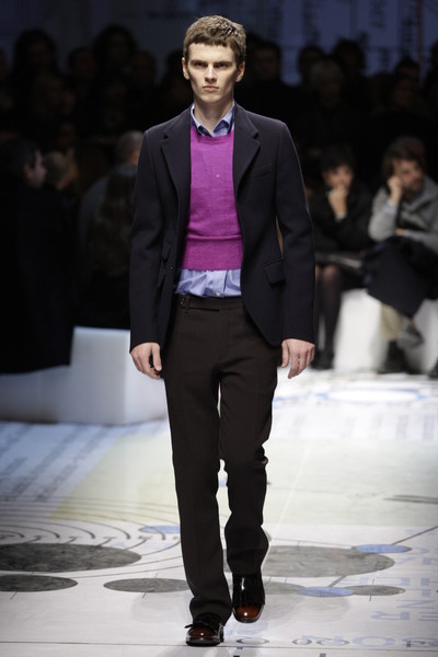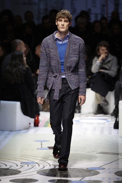 The menswear summer-collection Prada sent out yesterday had a sporty marine-vibe thanks to all the blue & white, the navyblue fishermen-sweaters, the boxy bermudas, wide trousers and lots of keels. It reminded me of the sportsgear sailors wear during a storm or a windy day at the boat. It looked boyish too because of the oversized silhouettes, the multi-colored knitwear and last but not least the shoes with thick soles. You could almost hear them squeeze.