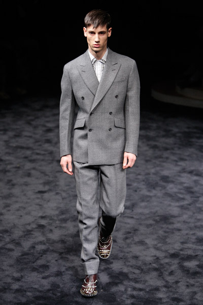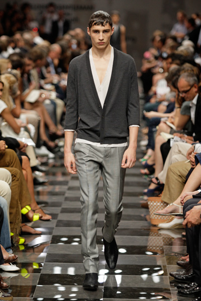 Miuccia Prada’s collection looked like an old Fifties movie, a little odd, vintage futuristic and yet very modern. She focused on grey suits, but thanks to modern fabrics like mesh, new loose wovens and graphic patterns the models looked like they came from another planet. Suits were pared to their barest bones, perforated, stripped of sleeves and any traditional detail. Instead of shirts there were raw hemmed, silky V-necks. It was sexy, sensitive and even vulnerable. But also young.