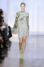 It was the first time Preen had knitwear and art and crafty embellishment in a collection, but it didn’t effect their future-vision. They experimented with proportions – hemlines were elongated, while single items looked like they were several garments. Shirt-sleeves and collars – appearing to be part of a shirt beneath – actually belonged to overcoats, jumpsuits appeared as matching trouser-and-shirt looks and tapered skirts with thigh-high splits were fitted with attached shirts. The effect was very modern. The vibrant pops of color, abstract geometric prints and embellished accents that jingled as the models walked by gave the classic silhouettes a touch of chic.