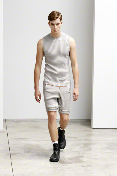 The Pringle ss2012 collection was the debut of designer Alistair Carr. He took the British label took into sportier territory. He fragmented the argyle weave for sweater vests, mixed paper-thin leather and knitwear for jackets and shorts, and made “twinsets” out of coats with linings that matched models’ T-shirts. Al very fashionable and young. Pringle also presented a collaboration with Puma: part Chelsea boot, part sneaker.