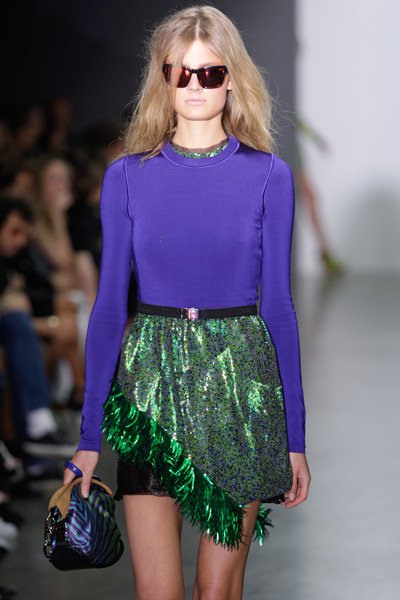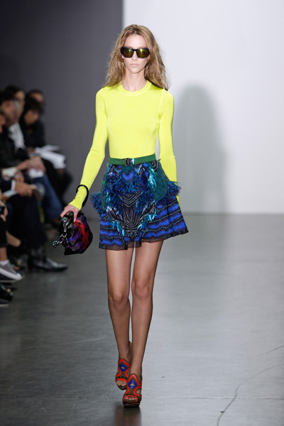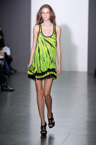 They wanted something young and fresh, so the guys from Proenza Schouler looked to surfing and skating, the things they grew up on. They took the notion of track jackets wrapped around waists and built those elements right into tank dresses and shirtdresses, and they teamed a pair of color-blocked track pants with a great tailored jacket for a sporty-chic effect. It’s the sort of nonchalant look a lot of designers are looking for, and these guys nailed it perfectly. For evening, the silhouette was short, short, short. A few of the cocktail numbers featured the bra-cup bodies the duo has made their signature, mixed with tiers of micro ruffles. Other dresses floated away from the body. The models wore wedge-heel woven sandals as colorful as the clothes.