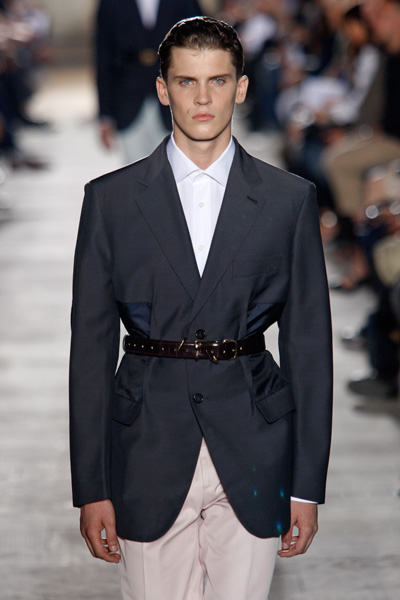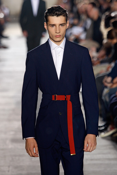 After two seasons of modern suits with that typical Belgian edge, Raf Simons pushed again the boundaries of menswear. He already played the game of closures at his collection for Jil Sander (with mixed results), but it worked out much better for his own fall collection. Still suits form the center part (but as the designer said earlier: he and his clients are grown up men now), Raf still favors dark colors, but he replaced the buttons with metallic magnetic closures and velcro strips which made a pretty tight silhouette and clean image. Simons also re-made the traditional trench by separating the coat into halfs and using the lower half as a skirt or protective shield. Besides that he played an interesting graphic game with red, white and blue.
