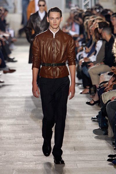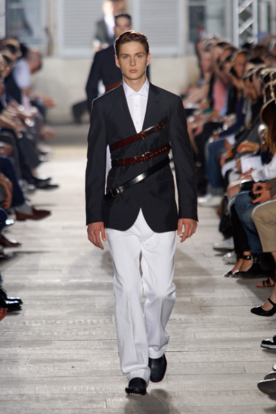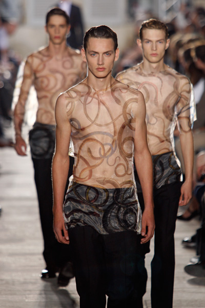 Raf Simons is ready for a new decade and said good bye to the teenage-trip he’s been on from the beginning. He aims at a new man now, and individual who is ready for suits wich are luxe and sober but also likes high fashion items like a knit torso with cloth jacket shoulders. Simons even developed a logo: a snake in an S-shape around an R. Wow, he’s serious now. The snake came back in belts and as a print for sheer tops and trousers.
