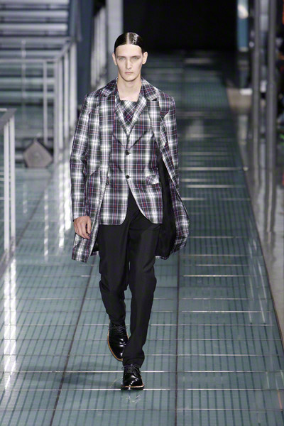 Before the show of Raf Simons even had started, rumors about the designer leaving his commercial partner were already spreading around. And the rumors seemed true, but did not affect the show and the collection at all. Simons sent out a calm, yet inventive collection with a mix futurism (pants in black PVC, mohair aprons) and preppy college style (sweaters, checks, Fair Isle knits). Duffel coats, in camel and brights, were the main statement. One voluminous version came in purple neoprene – worn with a sharp shirt and tie and a scarf – while another cocoon-shaped design in tomato red fastened with a single closure at the neck.