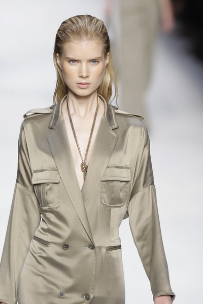 JPG added his iconic cone-bra. There were overalls with and without sleeves. Most were made out of denim, yet Roberto Cavalli made one out of a transparent airy fabric and Hannah MacGibbon introduced a leather one for Chloé.