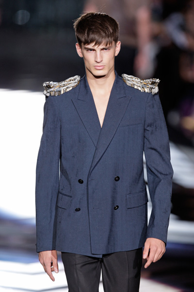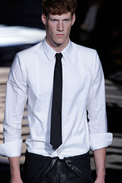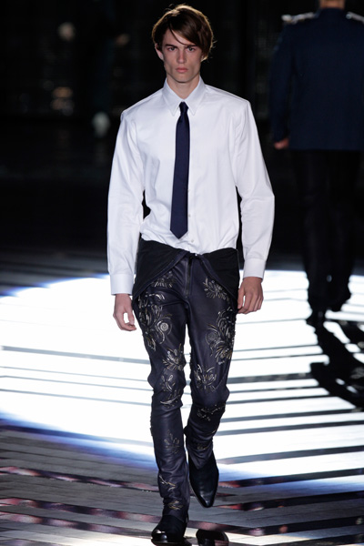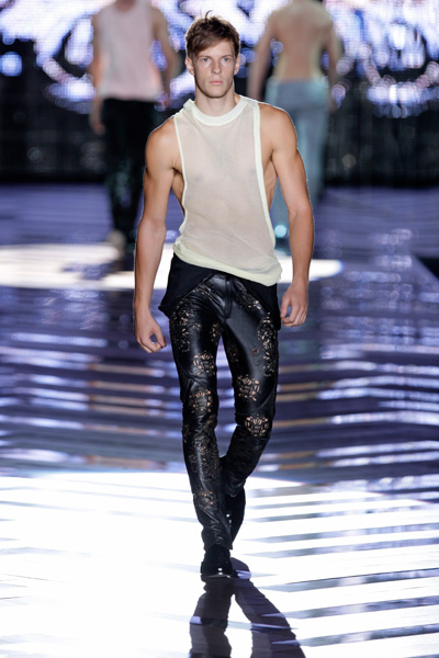 The collection of Roberto Cavalli didn’t send out a clear message. Skinny, perforated leather pants, shirts without sleeves, jackets, leopard prints and pastelshades. It reminded us of heavymetal bands and rockstars.