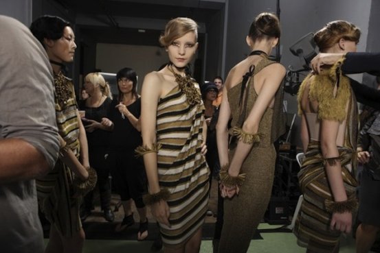 Earthy colors and stripes – just what you needed to add some eastern influences to your wardrobe. Here backstage at Roland Mouret.