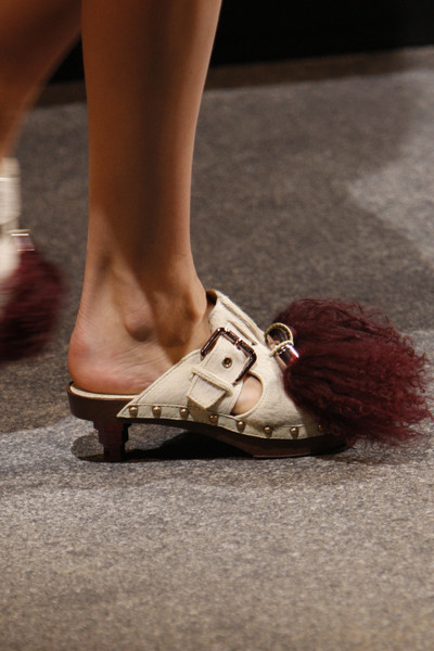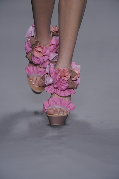 Armani, Chloe, Marc Jacobs, Anna Sui and Karl Lagerfeld all used sandals in their shows. They formed a big contrast with the high heels, not only because of their height but also because of their looks. The sandals were flat, plain and didn’t have any color in them (we only saw them in black and brown). Armani fortunately did add a flower to his sandals, Anna Sui decorated hers as well and at Valentino a bow was put at the back of the sandals.