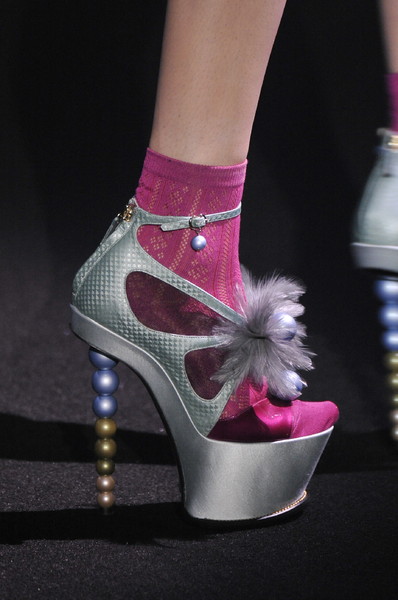 The shoes in the Jil Sander show had iron pins for heels. Donatella Versace used platform shoes. John Galliano’s shoes were extremely high and his stiletto heels seemed to be made of colored pearls. Chanel introduced a few clogs.
