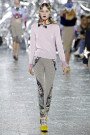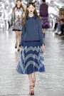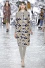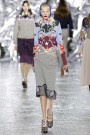 Micheal Kors’ show was all about function made special and chic — coats (and more coats), sweaters, pants and skirts. How everyday can it be? Kors opened with the basics — peacoat, white blouse, pullover and jeans, but the jeans happened to be feathered from the knees down. Camel made it onto the runway in a shawl-collared coat — a floral mink, worn over a sweater and cropped pant. Other coats got abundant fur collars or were cut in glistening floral brocades. An officer’s coat was sashed in mink. Another simple pleasure, knitted cashmere, came in a charcoal sweater-and-skirt duet that got the reality diva treatment with feathers. Kors kept his shapes from classic to retro.