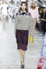 Marc Jacobs showed his extravaganza of fashion-noir on a stark white set to the sound of single chimed notes by Japanese musician Keiji Haino. Darkness ruled, but with an underlying sweetness. The models’ eyes and lips were black. The clothes were dark, wondrous, inventive, eccentric pilings of tweeds, furs, silks, and endless decoration, Victoriana meets Goth meets Biker Chic meets Varsity Chic meets Red Carpet meets Violet Incredible and countless other girls of Jacobs’ runways past. Cats, rats, cherubs and ballerinas got acquainted on prints, a giant raven took up residence on the back of a jacket and a lady named Gaga walked the show.